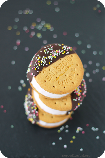 Estos sandwiches son de los que os hablaba en el post anterior, están hechos con la mezcla que me sobró de la tarta de cerezas. Son súper fáciles, sólo necesitáis unas galletas digestive, chocolate para fundir y cualquier cosa para decorar... bolitas, fideos multicolor, almendras, etc...